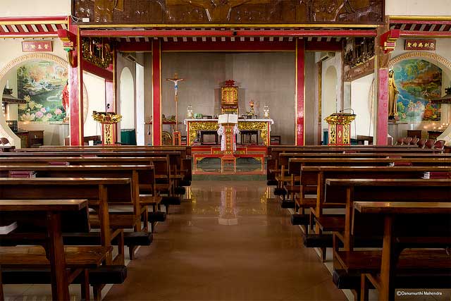 Nuansa Tionghoa lengkap dengan warna merah dan emas yang mendominasi eksterior gedung serta adanya patung singa yang biasa terdapat di kelenteng-kelenteng. Kebetulan sekali hari ini adalah hari khusus misa dengan bahasa Mandarin, ternyata gereja ini memiliki tradisi berbahasa Mandarin setiap hari Minggu.