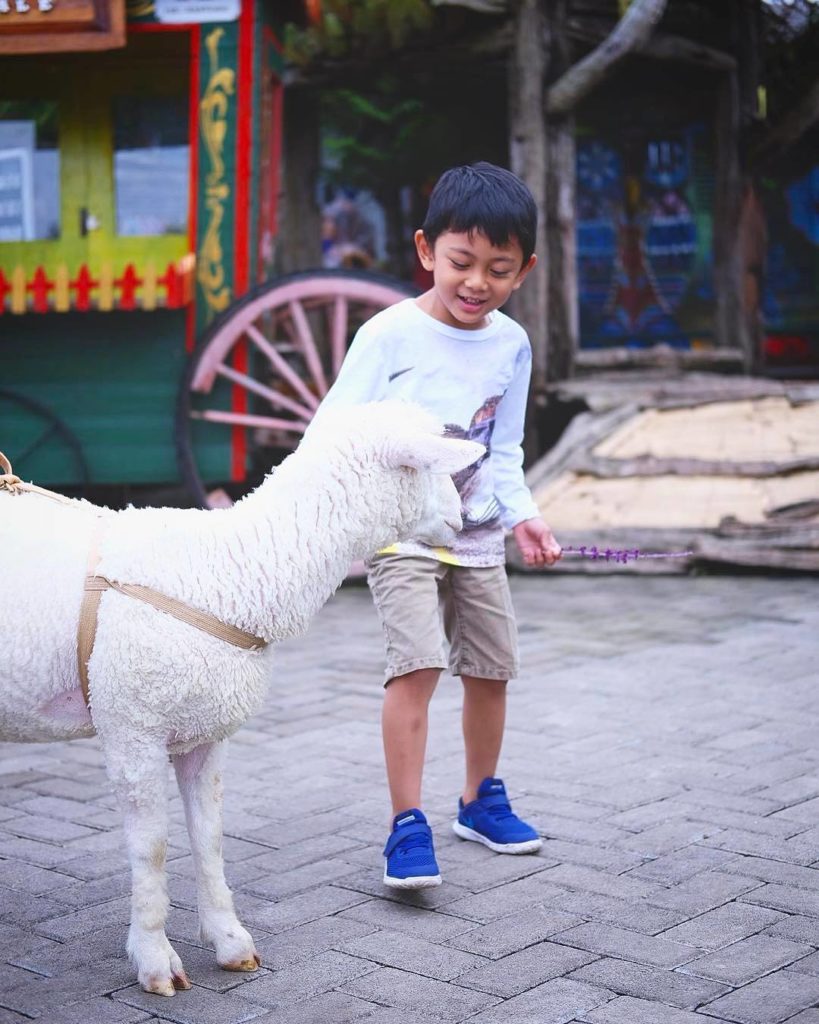 Anak-anak sedang bermain dengan domba. Foto dari @farmhouselembang