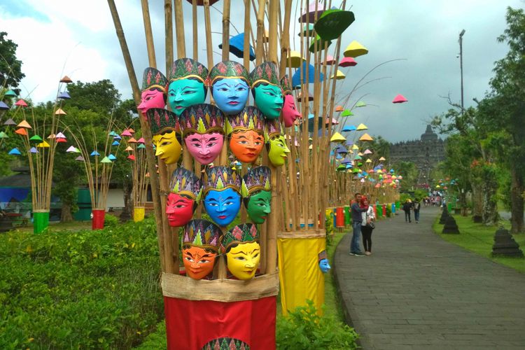 Tak hanya Anda yang bersolek saat Lebaran, Candi Borobudur pun demikian. Jika libur Lebaran nanti Anda berkunjung ke Candi Borobudur, sepanjang jalan masuk menuju candi dihiasi dengan ratusan topeng cantik berwarna-warni.